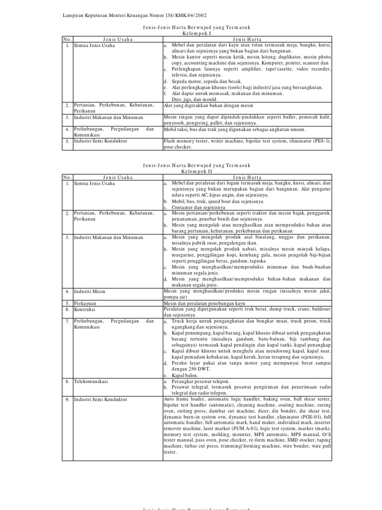 Berikut tabel kelompok aktiva tetap berdasarkan pmk 96/2009: